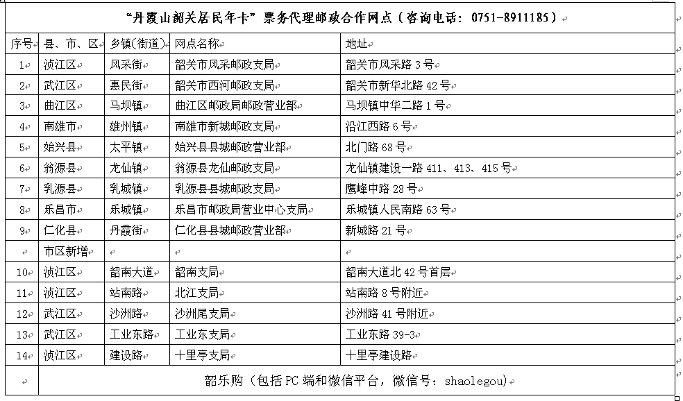 1.丹霞山外山门韶关居民年卡票办理点。2.韶关市各县市代售点见后附表。