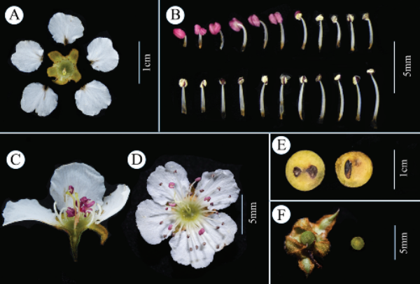 昭璇梨花解剖图(A.花的正面解剖; B.雄蕊; C. 花的纵切面; D.全花的正面; E.果实的横纵切面; F.子房的横切面)